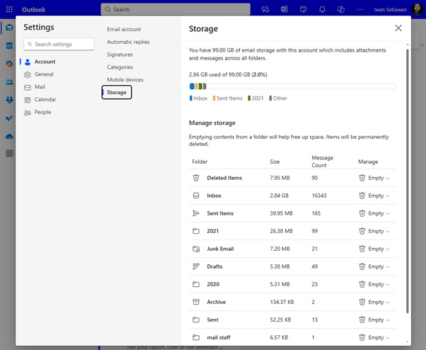 - Pada halaman Storage, Anda dapat menghapus data dari folder yang anda miliki.