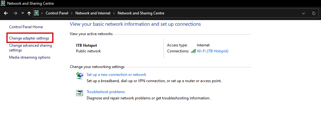 - Selanjutnya buka menu Control Panel → Network and Internet → Network and Sharing Centre → Change adapter settings