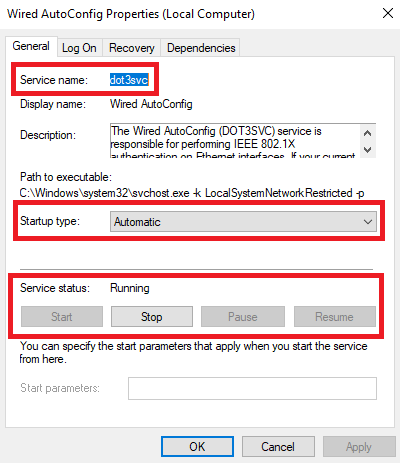 - Lakukan start pada services tersebut dengan cara klik kanan dan pilih start atau dapat di double klik kiri lalu memilih tombol start. Pastikan juga Startup Type pada service tersebut dalam keadaan automatic sehingga fitur dot1x authentication akan selalu otomatis menyala setiap kali PC dinyalakan.