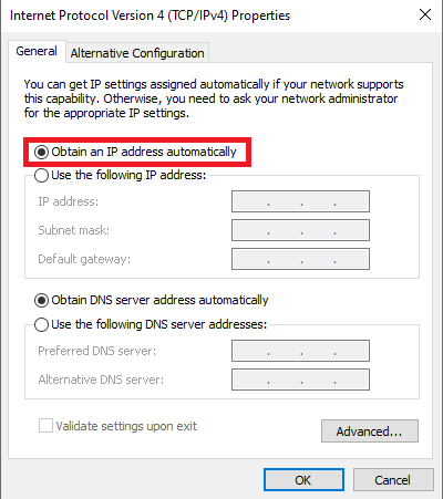 - Dalam jendela menu “Internet Protocol Version 4 (TCP/IPv4) Properties” pastikan kolom IP Address dalam kondisi DHCP atau memilih “Obtain IP Address Automatically” lalu pilih OK untuk menyimpan pengaturan.