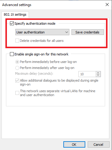 Selanjutnya pilih button Additional Settings dan akan muncul jendela Advanced Settings aktifkan / check specify authentication mode dan pilih user authentication, untuk credentialnya berupa username dan password ITB Account yang diinput pada button save credentials