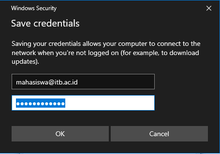 - Setelah username dan password ITB Account diinputkan pada save credentials. adapter network ethernet akan melakukan refresh dan loading untuk beberapa detik. apabila tahapan dan username password yang diinputkan sudah sesuai maka seharusnya laptop atau desktop sudah bisa mendapatkan koneksi internet.