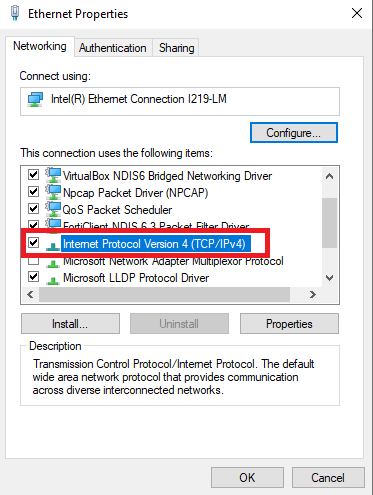 - Pada tampilan ethernet properties pilih dan double klik “Internet Protocol Version 4 (TCP/IPv4)”